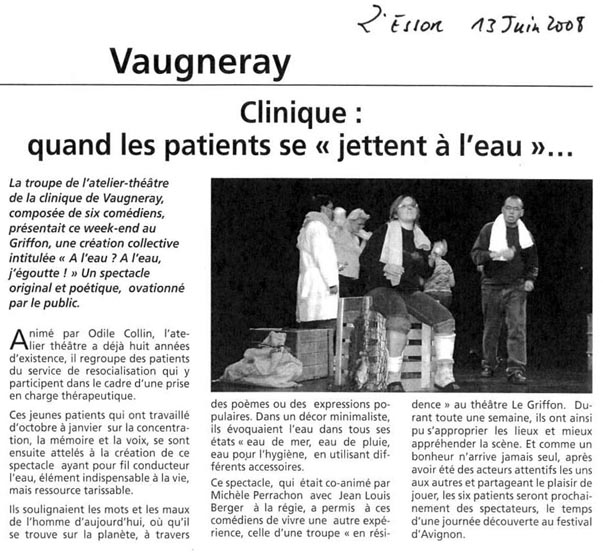 Cet atelier-théâtre (et poésie !) en milieu psychiatrique a fonctionné à Vaugneray à partir de 1998, animé par Odyle Collin, infirmière chef de service dans l'établissement. Sur la base d'un après-midi par semaine, avec environ 8 à 10 malades. Suivant les aspirations des malades et avec leur concours à tous les niveaux, des spectacles ont pu être montés de 1999 à 2010, joués "en fin de saison" dans l'établissement mais aussi parfois à la MJC du village, dans une auberge, dans le théâtre du village, pour des festivals locaux, voire nationaux, etc. Des spectacles qui mélangeaient, comme le dirait Claude Chalaguier* (dont Odyle Collin ne fera la connaissance que plus tard, voir plus bas) "acteurs dits handicapés avec d'autres dont on ne le dit pas".
